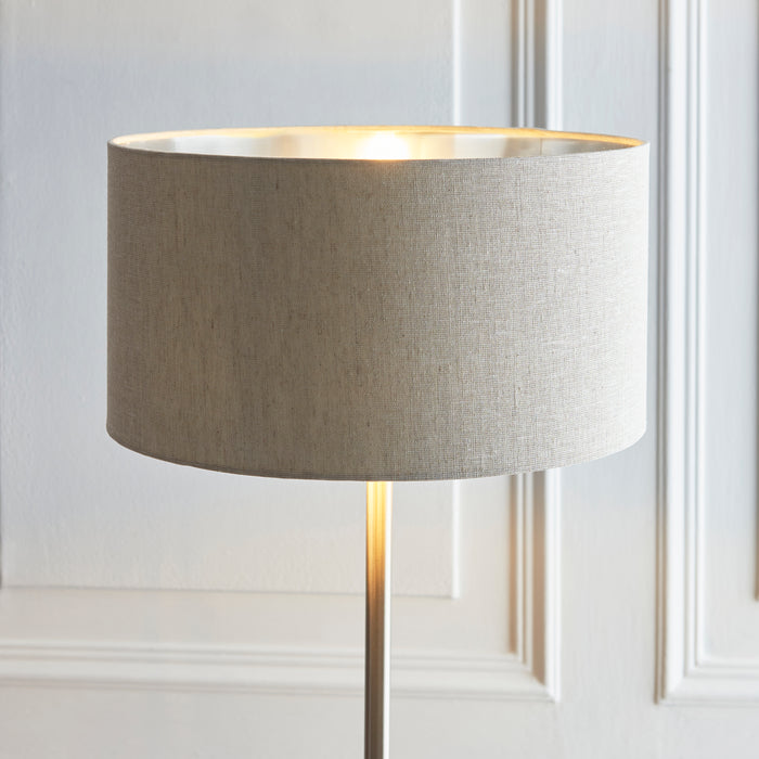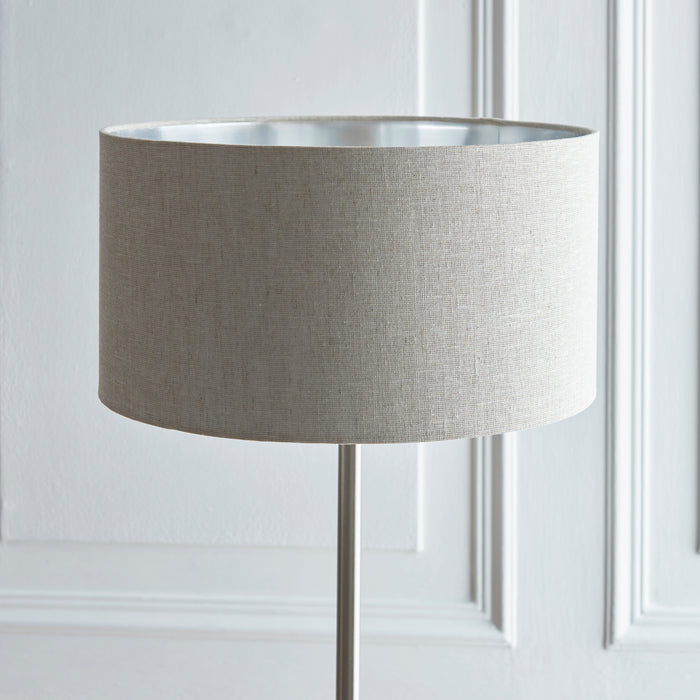 Product DescriptionThis floor lamp is a sophisticated mix of natural linen fabric with a reflective brushed metallic inner and brushed chrome metalwork. This statement floor lamp is the perfect timeless addition to modern and classic homes of today.