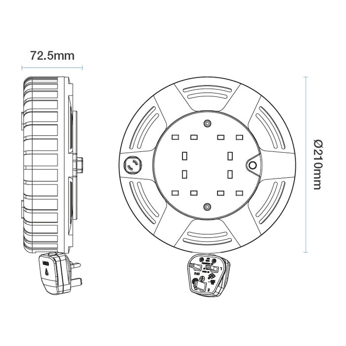 This medium cassette reel in blue with eight or ten metres of cable and four sockets. The cable is protected by the outer plastic casing which enables convenient and safe storage. This easy to use and practical design has an easy hold rear grip, ideal for domestic use or DIY.