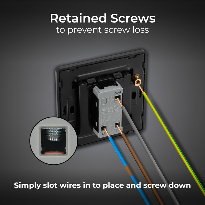 This Evolve 20A single light switch from BG will operate one light in a room. The 2 way switch lets a second switch be added to the circuit, allowing the customer to operate the same light from another location, e.g. either side of a room, or top and bottom of the stairs. The low profile edge-to-edge rocker clips in to place once the base is installed for a screwless appearance, with a large touch surface for easy operation and brushed steel finish. Installation is fast and secure with clearly labelled captive backed out terminal screws. The switch is certified to BS60669-1 standards, and comes with a 25-year guarantee for total peace of mind. BG’s Evolve range of wiring accessories is available in a variety of colours and finishes to give you greater choice and flexibility when choosing electrical accessories.