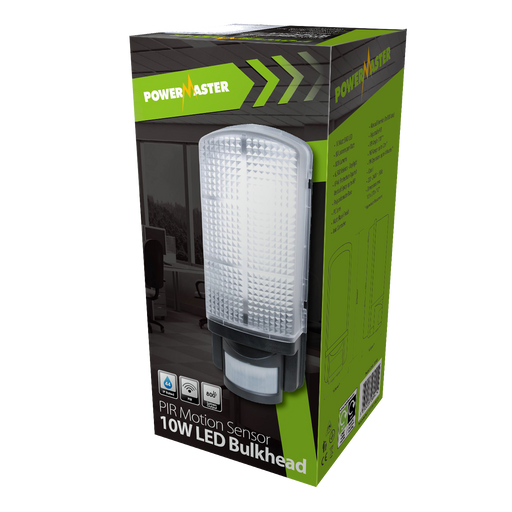 Powermaster S9348 10W IP44 Polycarbonate LED Bulkhead with PIR Motion Sensor Features Polycarbonate Prismatic PC Lens 10W SMD LED Anti Corrosive ...