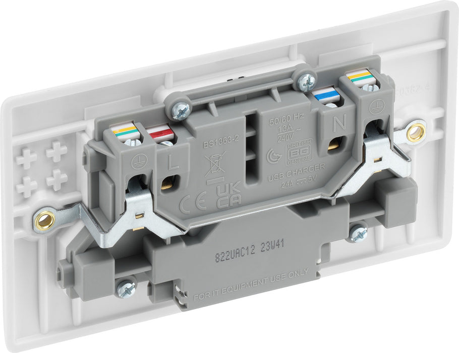 BG 822UAC12 White Round Edge 13A Double Switched Power Socket + USB A+C (12W)