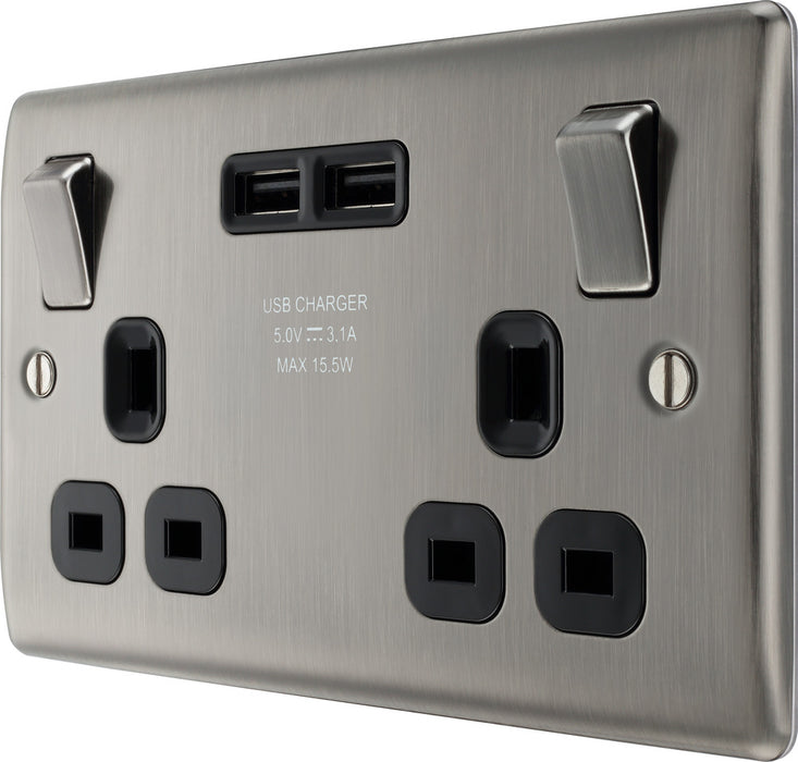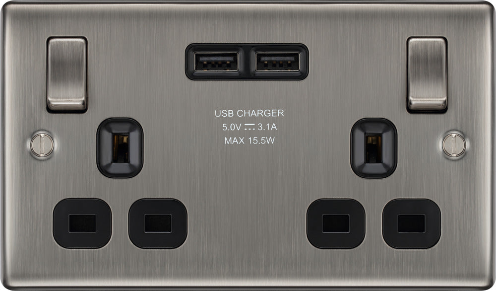 BG NBI22U3B Nexus Metal Double Socket + 2x USB(3.1A)/Black Insert - Brushed Iridium