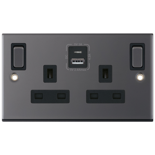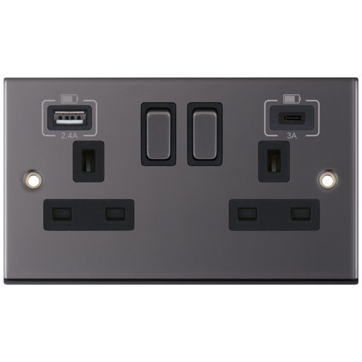 Selectric DSL463 5M 2 Gang 13A Switched Socket Outlet with 1x USB Type-A (2.4A) & 1x USB Type-C (3A) - Black Nickel, Black Insert