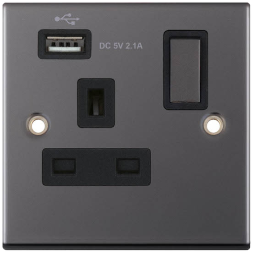 Selectric DSL460 5M 1 Gang 13A Switched Socket Outlet with 1x USB Type-A (2.1A) - Black Nickel, Black Insert