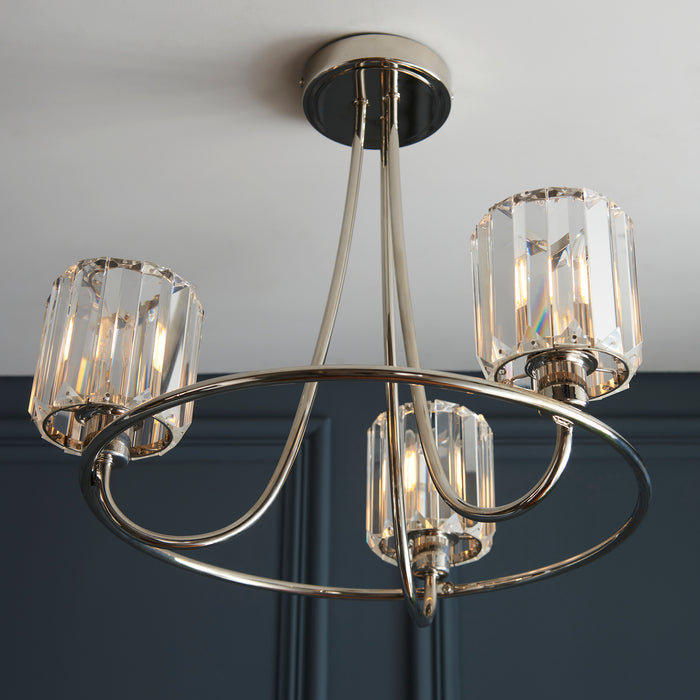 Product DescriptionSophisticated 3 light semi flush with decorative clear cut faceted glass shades that beautifully disperse the light. Elegant arms in a bright nickel plate finish; perfect for low ceilings. Other matching items available.