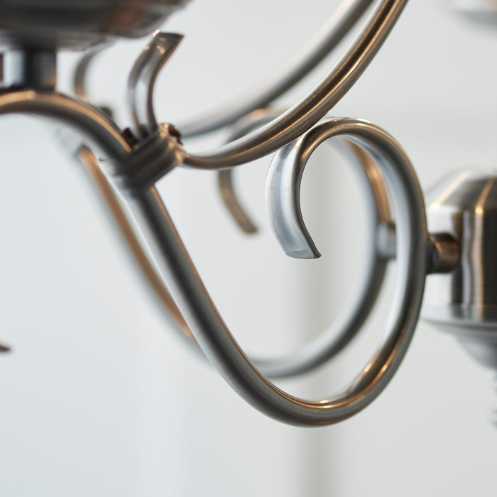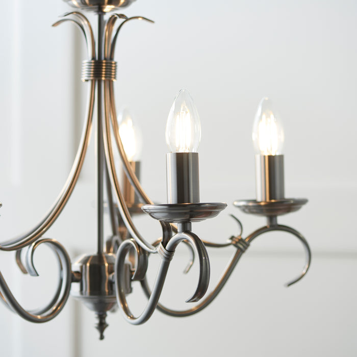 Product DescriptionA 5 light ceiling fitting with scrolled arms in antique silver effect finish. suitable for use with LED lamps, height adjustable and dimmable. Matching items available and also comes in an antique brass finish