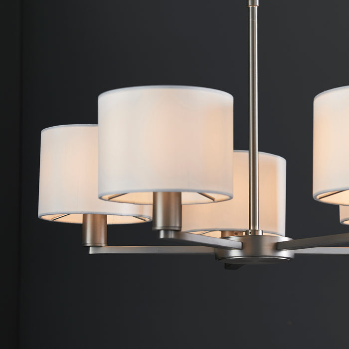 Product DescriptionAn understated modern 5 arm pendant, mixing a subtle matt nickel plated finish with timeless vintage white faux silk shades. Modern styling for today's interiors. Matching items also available.