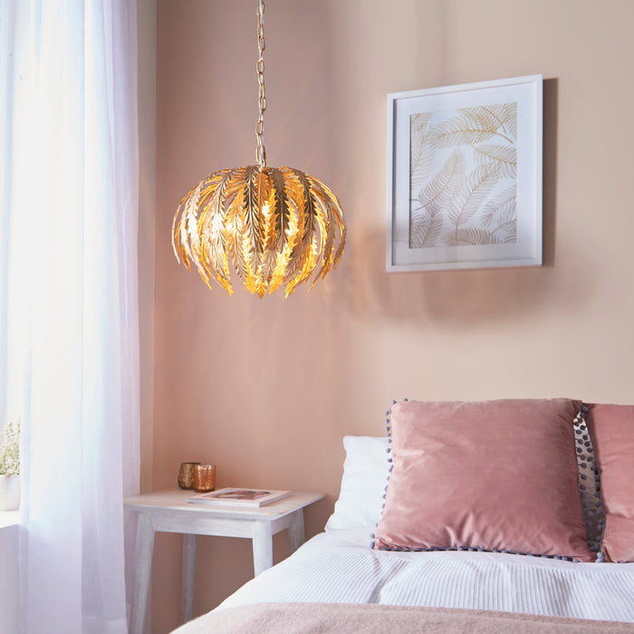 Product DescriptionAn opulent and ornate gold leaf finished floral pendant light, formed from long floral leaves and suspended from height adjustable chain. Add some gold glamour to your interior, perfect when paired with LED filament lamps to create striking light patterns.