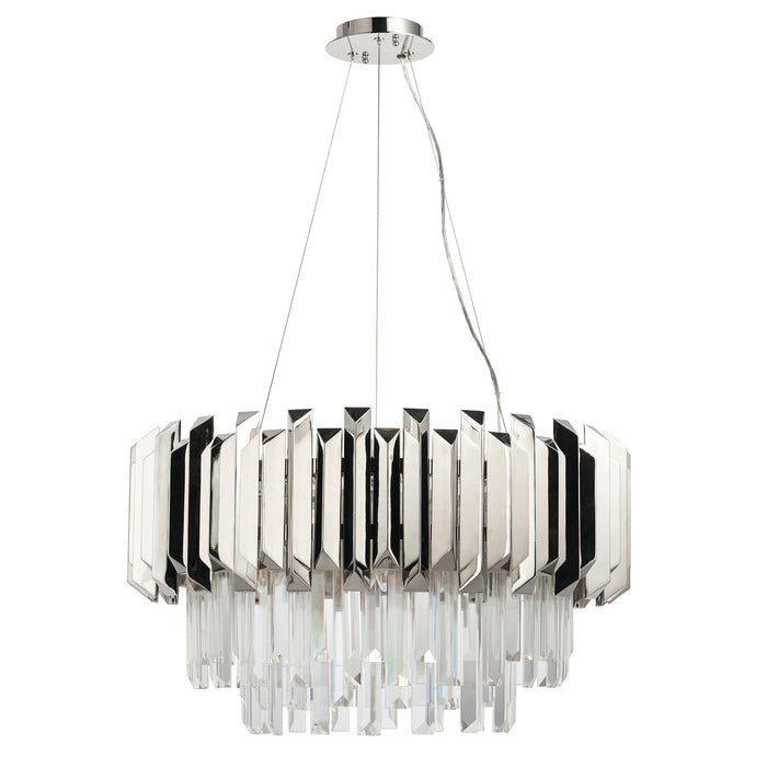 Product DescriptionAn impressive mix of polished stainless steel metal and high quality prism shaped clear glass crystals. This grand pendant will add finesse to any interior. Suspended from height adjustable cables and clear flex, create a statement by pairing with LED lamps.