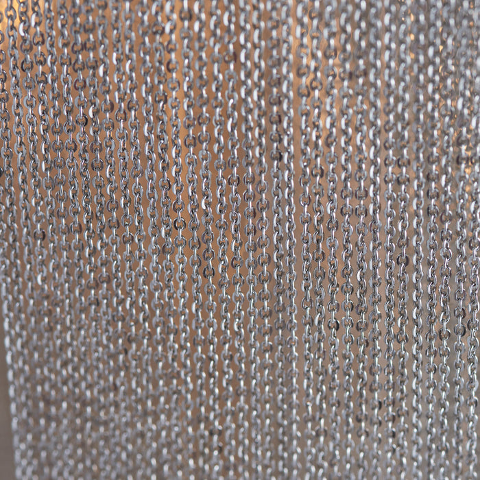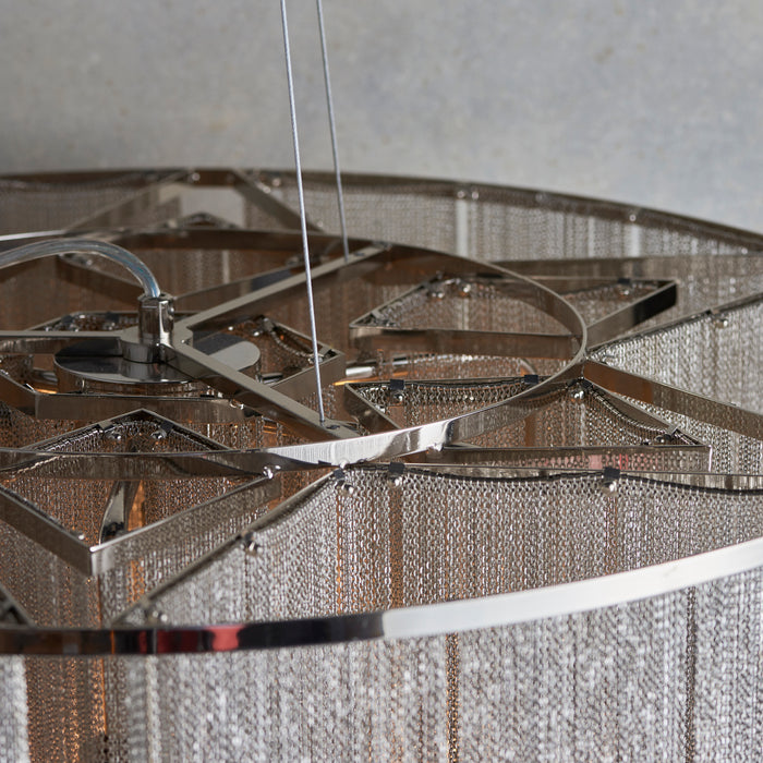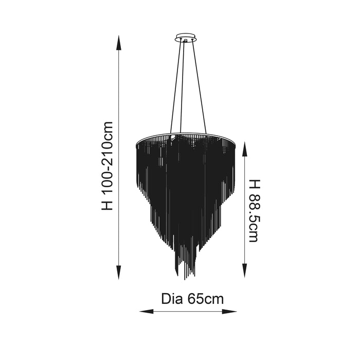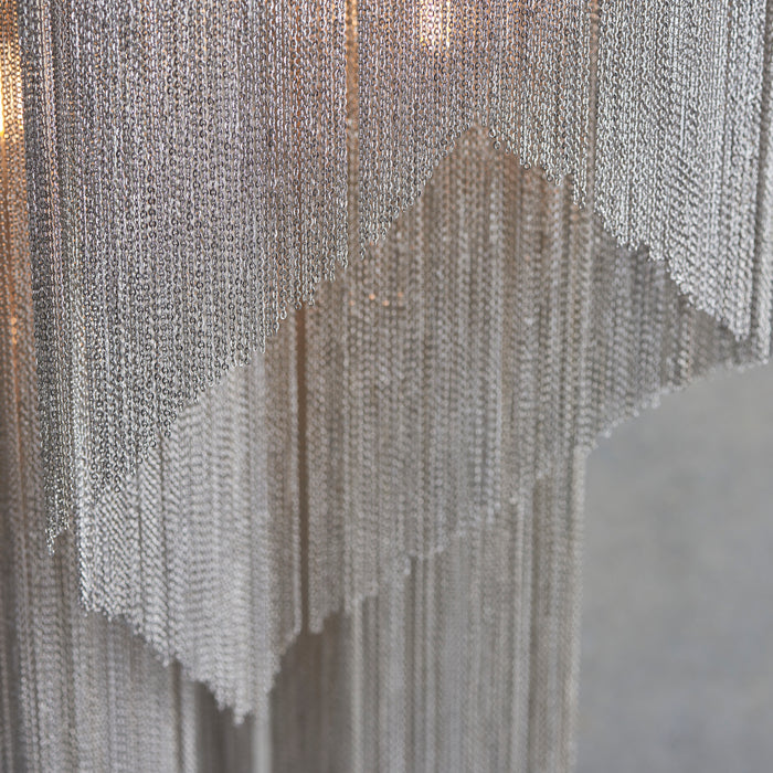 Product DescriptionThe Loire seven light pendant delicately hand dressed with thousands of beautiful fine chains, creating a lavish work of art. The perfect centre piece. Carefully suspended from height adjustable delicate wire with clear flex. Create a beautiful diffused light with the use of LED filament lamps.