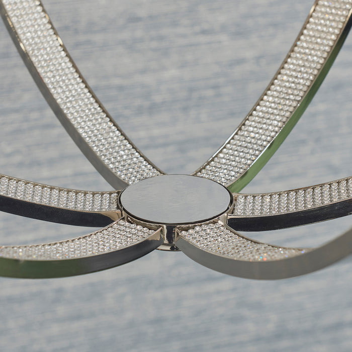 Product DescriptionThis timeless ceiling pendant combines highly polished bright nickel metalwork encrusted with thousands of clear faceted reflective details with a modern open frame design. Perfect when paired with the latest LED filament lamps. Suspended from height adjustable chain with clear flex.