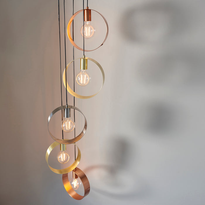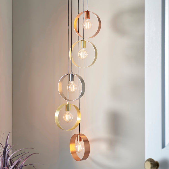 Product DescriptionThe perfect 'must have' multi pendant light. The mixed plated finishes and open hoop design make this bang on-trend with a fun contemporary aesthetic, easily placeable in today's modern homes. Pair with LED filament lamps to complete the look.