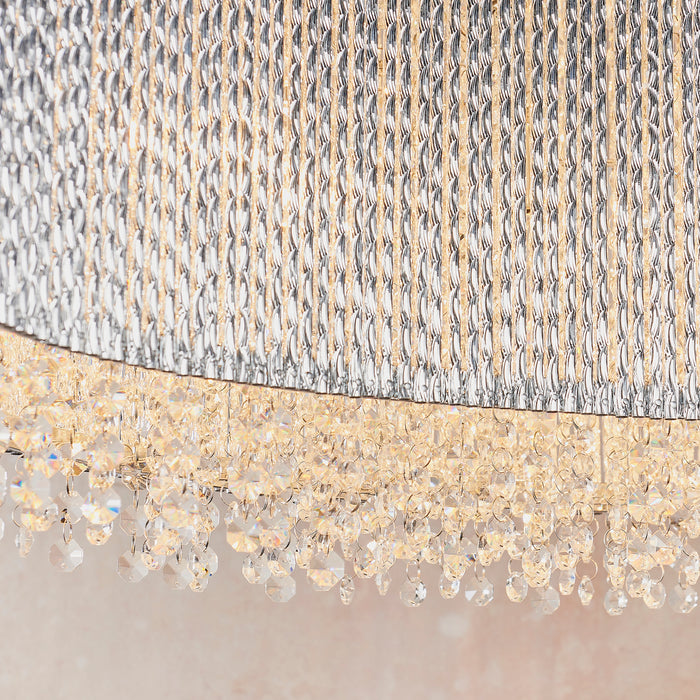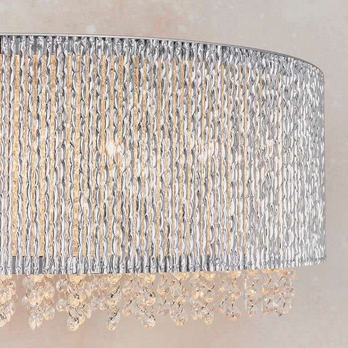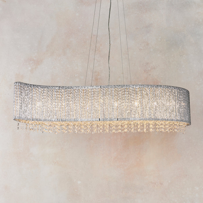 Product DescriptionThe perfect opulent linear pendant, create striking light patterns with thousands of high quality crystals housed within decorative twisted polished chrome rods formed into a unique sweeping wave shape, the perfect centrepiece for the most loved rooms of your home.