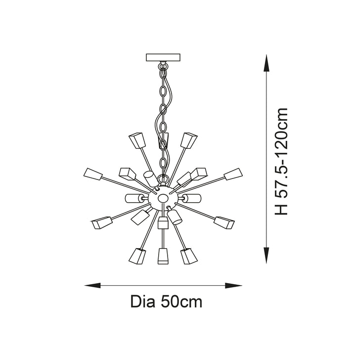 Product DescriptionAn eye-catching satin brass pendant in a visual sphere shape created by beautiful crystal adorned rods. Suspended by an attractive height adjustable link chain.