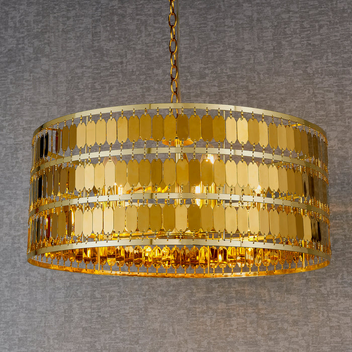 Product DescriptionThe Eldora pendant light with hexagonal detailing will give modern interiors a designer look with glistening gold light reflections. Features height adjustable chain rope.