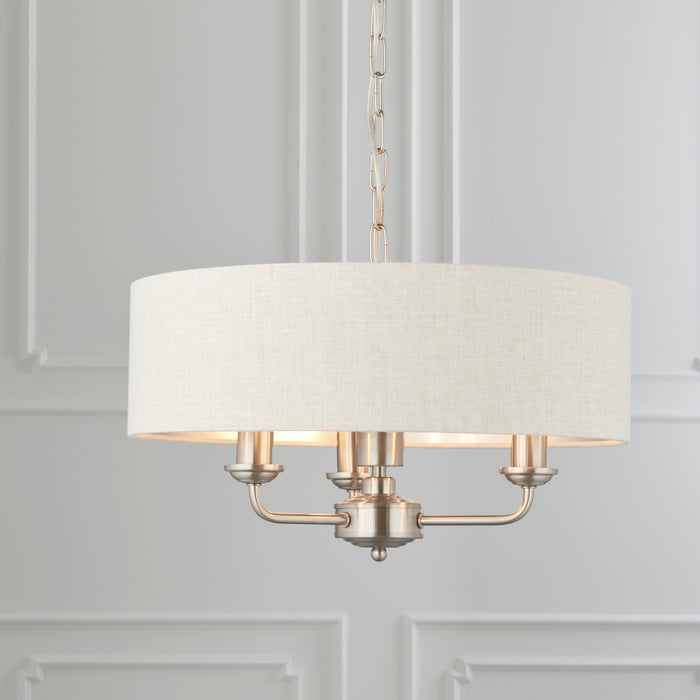 Endon 94361 Highclere 3lt Pendant Brushed chrome plate & natural linen 3 x 40W E14 candle (Required)