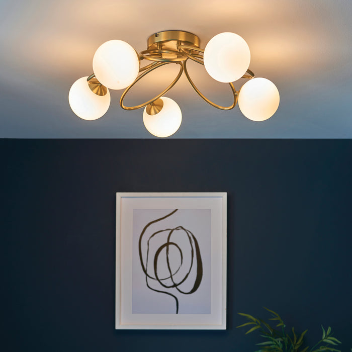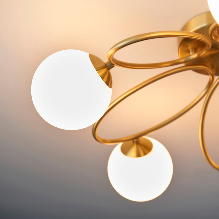 Product DescriptionContemporary semi flush ideal for low ceilings. Trendy oval metal work in satin brass plate finish pair with matt opal glass shades to create this stylish dimmable light.