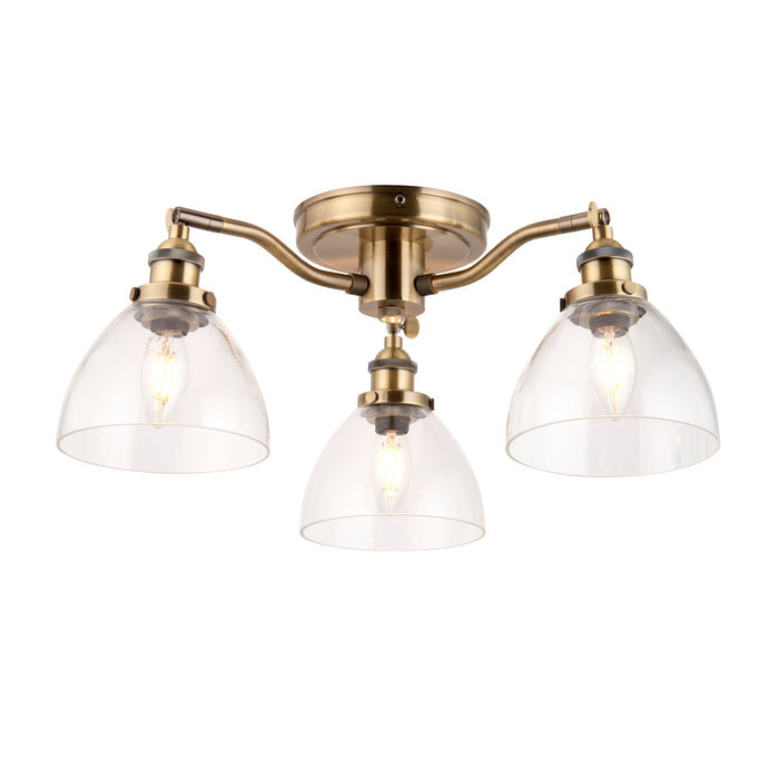 Product DescriptionAn authentic 'resto' style industrial 3 light semi flush, finished in antique brass plating with authentic knurled lamp holder details and clear glass shades. Pair with filament LED lamps for that perfect industrial style. The perfect addition for today's stylish homes to create that on trend bar, bistro look. Other Family items available.