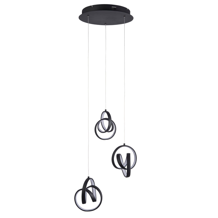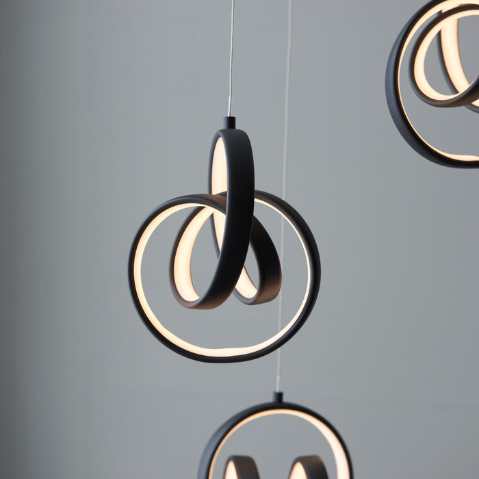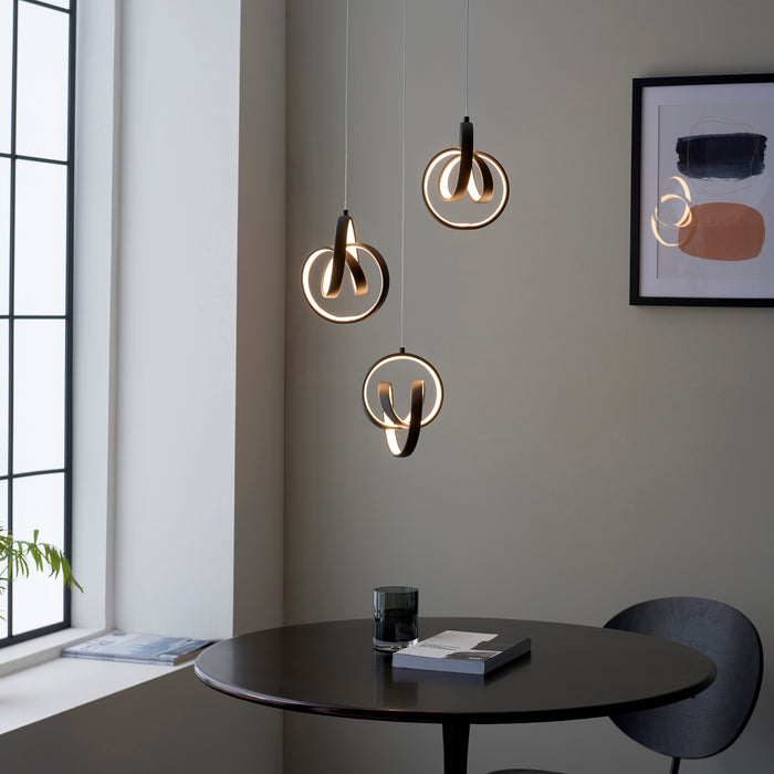 Product DescriptionLED 3 light pendant with textured matt black finish. Intriguing swirling loops effortlessly suspend from clear flex lengths that can be adjusted in height to create a contemporary statement pendant. Dimmable when twinned with a trailing edge dimmer switch.