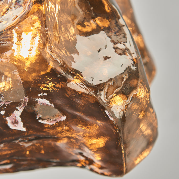 Product DescriptionInspired by volcanic rock formations, this statement pendant in metallic chrome glass emits an attractive ember glow and features an adjustable clear flex allowing you to alter the height. Perfect when paired with LED filament lamps