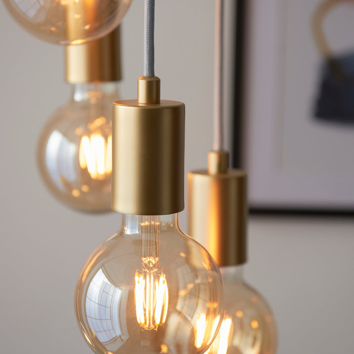 Product DescriptionGet the designer look with the Studio 6 light pendant, finished in a smart brushed brass plate, perfect when paired with LED filament lamps for that essential, on-trend look.