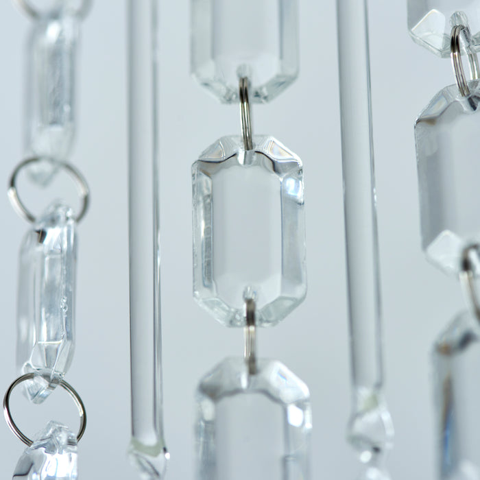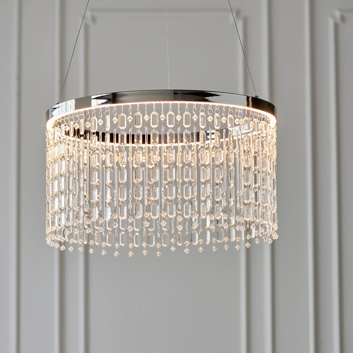 Product DescriptionCascading clear glass crystals hang from polished chrome ring creating beautiful refracting light. A statement piece that is energy efficient with integrated LED.