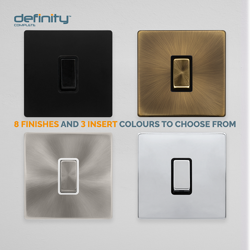 Definity Complete plates are available with Black or White inserts. Brushed Stainless and Stainless Steel are also available with Grey inserts. Metal White and Polar White are only available with Polar White inserts. Matt Black, Metal Black, Antique Brass and Matt Bronze are only available with Black inserts.