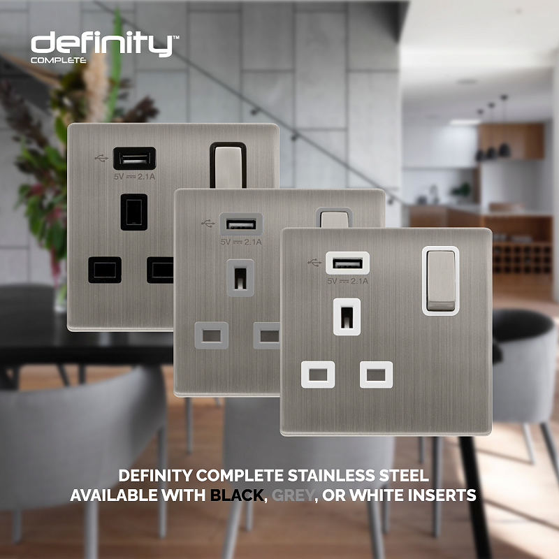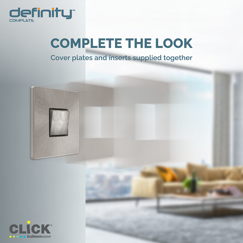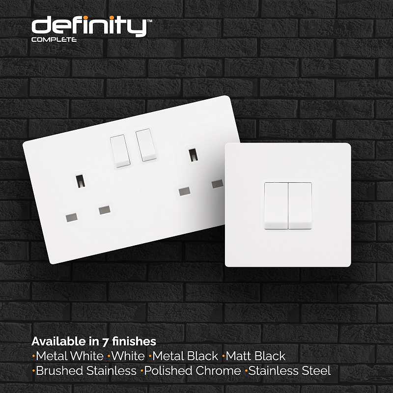 The smooth clean lines of Definity Complete products provide the ultimate finishing touch to a feature packed range of decorative domestic electrical accessories. Definity Complete has evolved from our well established Define® flat plate accessory range and features all of the same attributes including modular switching but without visible fixing screws.