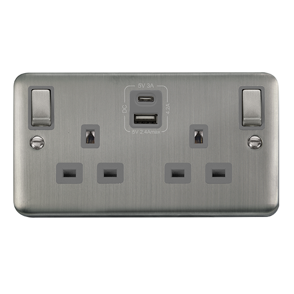 Click Deco Plus DPSS586GY 13A Ingot 2G Switched Socket + Type A&C USB - Stainless Steel (Grey)