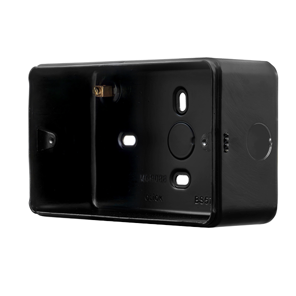 A robust new range of durable, stylish wiring accessories built to withstand the demands of everyday use. Designed with a sleek, curved profile with matching back box profile, Metal Clad Pro combines modern aesthetic with our latest innovations for secure, long-lasting performance in any environment.This item is Metal Clad Pro 2 Gang 50mm Deep Surface Mounting Box - Black