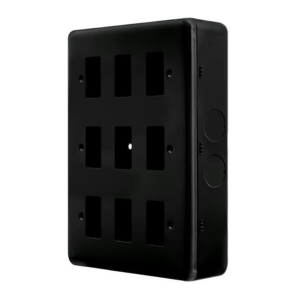 A robust new range of durable, stylish wiring accessories built to withstand the demands of everyday use. Designed with a sleek, curved profile with matching back box profile, Metal Clad Pro combines modern aesthetic with our latest innovations for secure, long-lasting performance in any environment.This item is Metal Clad Pro 9 Gang Gridpro Front Plate - Black