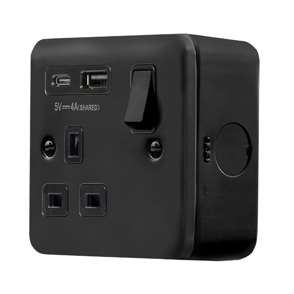 This item is Metal Clad Pro 13A 1G Safety Shutter Switched Socket Outlet with Type A & C USB (4A Shared) Outlets - Black