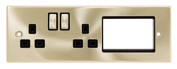 This item is Half New Media Part Furnished Front Plate - 2 X 13A DP Switched Sockets & 3 Apertures - Black - Satin Brass