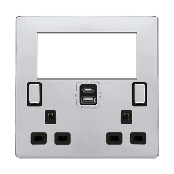 This item is 2 Gang 3 Pin Safety Shutter Type A & C USB Switched Socket with Quad New Media Apertures - Polished Chrome Cover Plate - Black Insert
