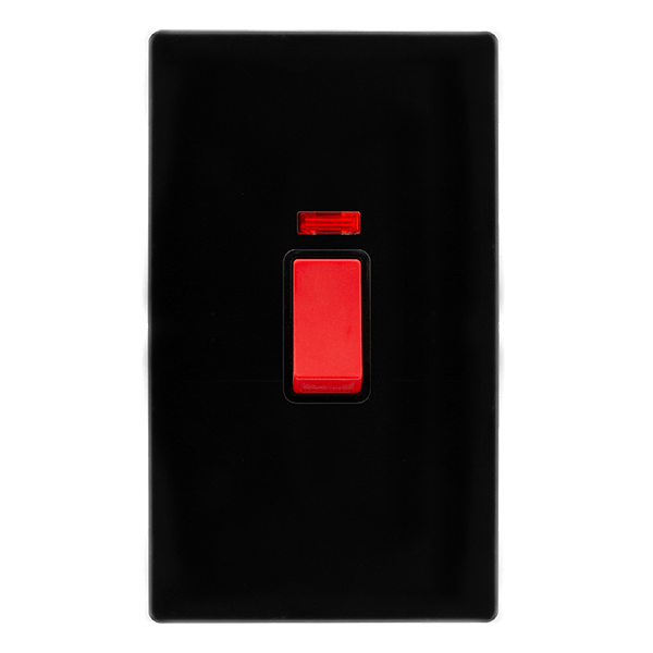 This item is 50A 2 Gang Double Pole Switch With Neon - Metal Black Cover Plate - Black Insert