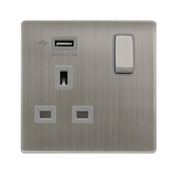 Click Definity Complete SFSS571UGY 13A Ingot 1 Gang Switched Socket With 2.1A USB Outlet - Stainless Steel Cover Plate - Grey Insert