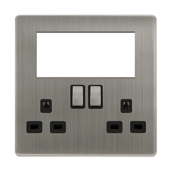 This item is 2 Gang 3 Pin Safety Shutter Switched Socket with Quad New Media Apertures - Stainless Steel Cover Plate - Black Insert