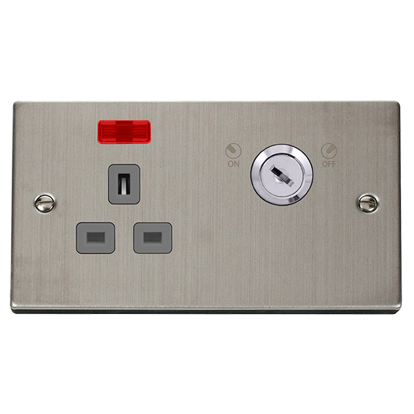 This item is 13A Ingot 1G DP Key Lockable Switched Socket + Neon - Victorian Stainless Steel (Grey)