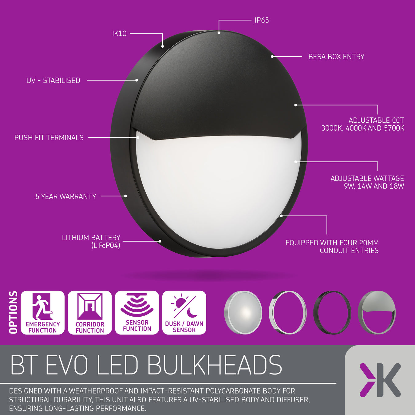 Knightsbridge BTEV BT EVO 230V IP65 IK10 Adjustable Wattage and CCT LED Bulkhead The Knightsbridge BTEV BT EVO is a premium LED bulkhead luminaire ...