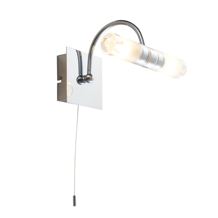 Product DescriptionThis 2 light wall and mirror lamp is designed with polished chrome effect plate and clear, frosted glass shades. IP44 rated with a pull switch to turn the lights on/off. Matching product available
