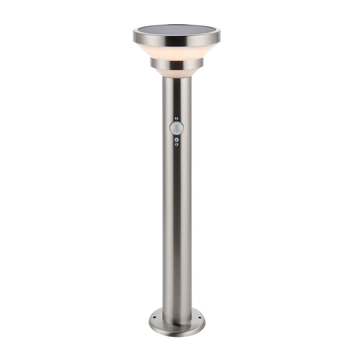 Product DescriptionSave on energy bills without compromising on style. Modern design solar powered post light with brushed stainless steel ad white pc diffuser. PIR sensor to help light the way - 110 degrees detection angle and 8m maximum range. Three intelligent modes to choose from: MODE ONE (CONSTANT) Automatically illuminates at dusk with low light. MODE TWO (BOOST) Automatically illuminates at dusk with low light and gets brighter when motion is detected. MODE THREE (SECURITY) Only illuminates when motion is detected with bright light for 25 seconds. IP44 rated for safe outdoor use. Matching family items also available.