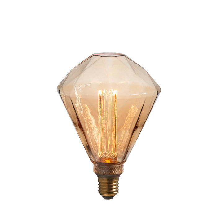 Product DescriptionAmber tinted facetted glass E27 LED lamp. With anti-glare LED light source this lamp gives of a diffused glow from its etched acrylic inner. A lamp with character and interest. Lamps make for a great gift when paired with a table base; can also be used with flex set.