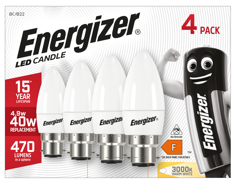 Energizer S14331 4W 470lm B22 BC Candle LED Bulb Opal Warm White 3000K (4 Pack)