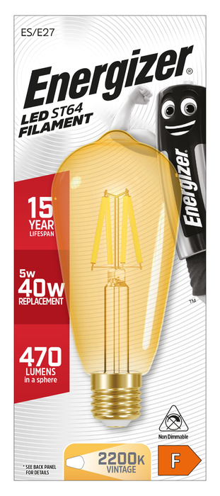 Energizer 5W 470lm E27 ES ST64 Filament Gold LED Bulb Warm White 2200K