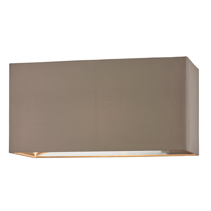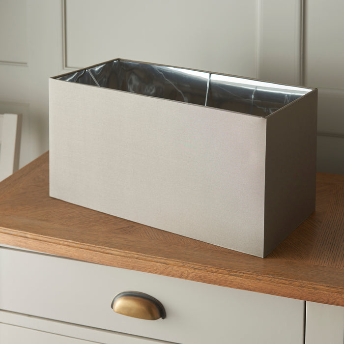 Product DescriptionThe Cassier shade is a straight sided rectangular shape finished in a taupe pure silk and lined with a chrome effect foil. Also available in a medium size.