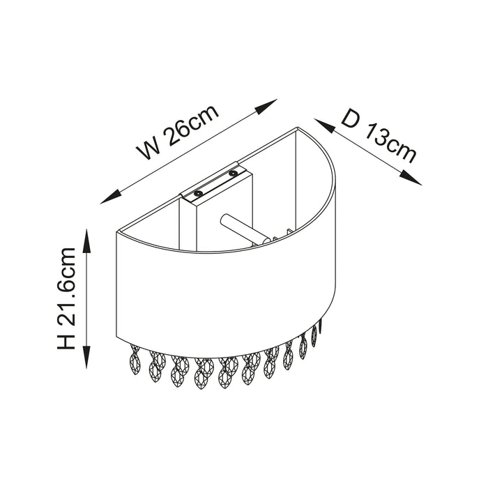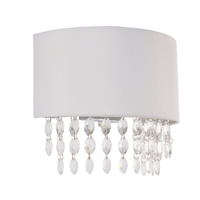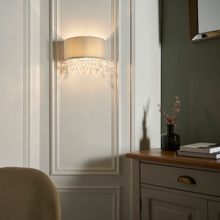 Product DescriptionStunning multi layer wall light with silver grey fabric shade. Complete with double row of facetted glass crystals and dimmable to create a stylish ambience. Matching pendant also available.