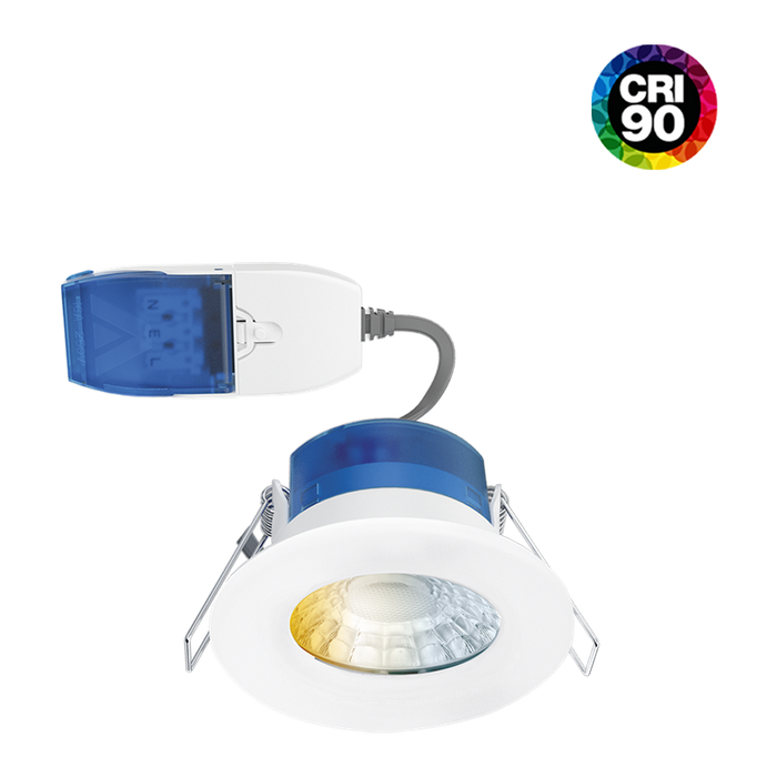 Product DescriptionR6™CWS CRI90 FIXED 4-6W COLOUR & WATTAGE SWITCHABLE FIRE RATED DOWNLIGHT WITH FASTRFIX