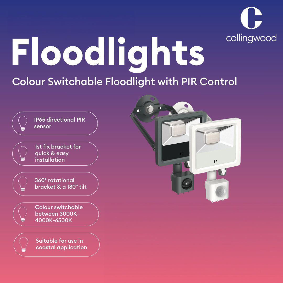 Collingwood FL03BPCS Black 30W Colour Switchable Floodlight, IP65, PIR With a wide 120° beam angle and a unique 360° rotation, this 30W flicker-f...