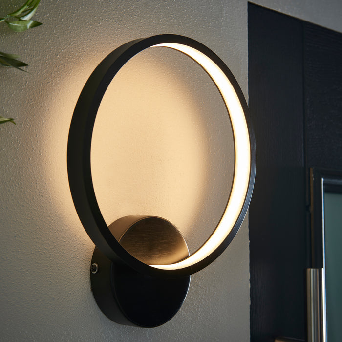 Product DescriptionDesigner architectural style wall light. Textured black finish with white diffuser this circular wall light is IP44 rated and corrosive resistant; safe to use in bathrooms and outdoors.