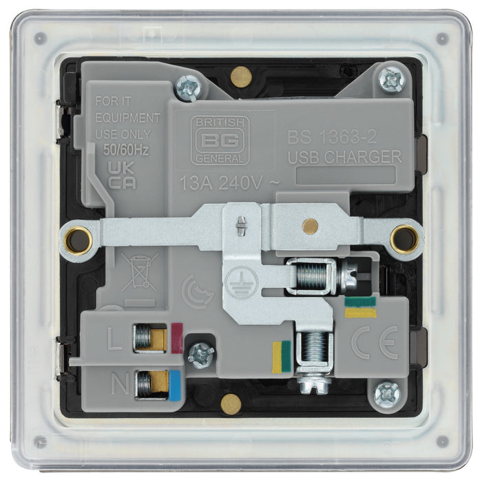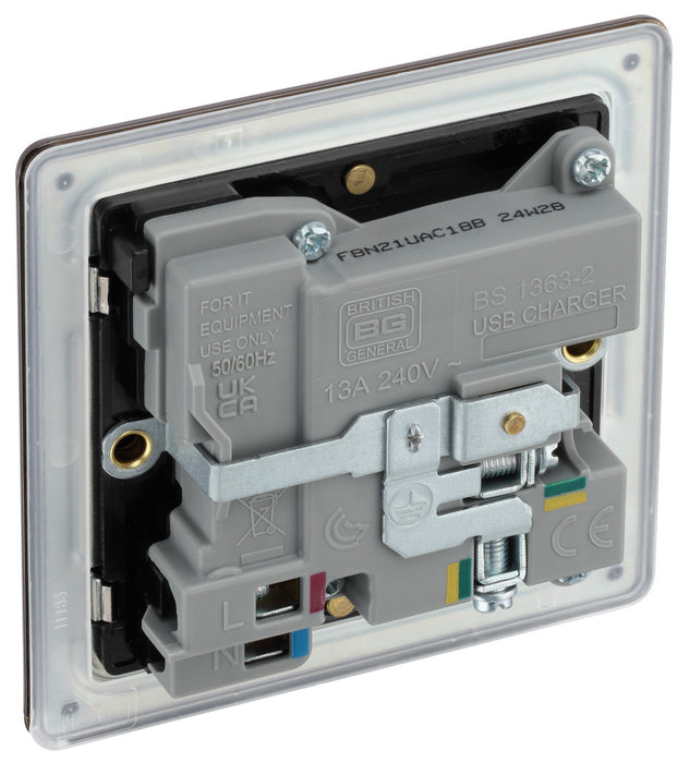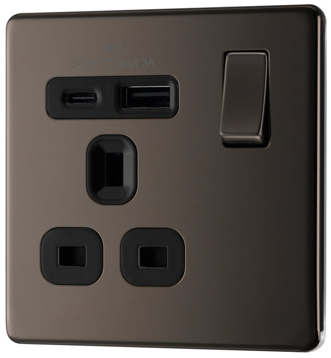 BG FBN21UAC18B Flatplate Screwless 13A Single Switched Power Socket + USB A+C (18W) - Black Nickel + Black Insert